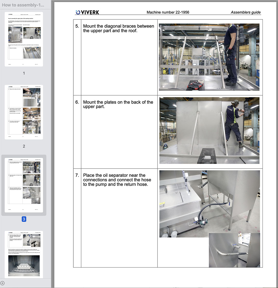 Kunden i fråga har stor erfarenhet av Viverks maskiner sedan tidigare och i detta fall där maskinens lucköppningssystem och externa enheter som oljeseparator och lastplattform ska monteras på plats har Viverk tagit fram en extra bildillustrerad monteringsinstruktion med steg för steg-anvisningar för att eliminera eventuella språkförbistringar.