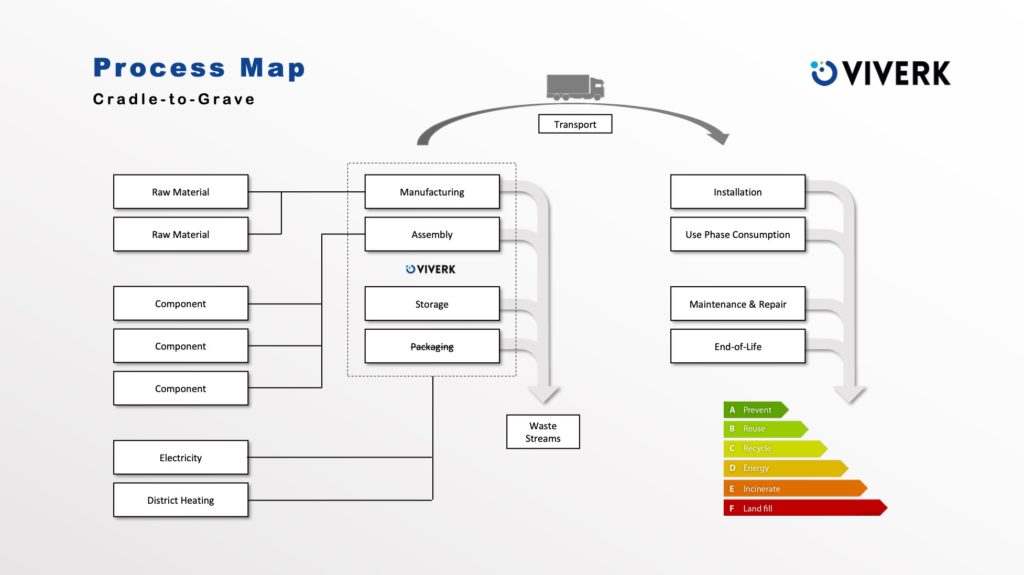 Vad som ska analyseras beror förstås på produktens beskaffenhet, och i Viverks fall resulterade det i processkartan ovan med en tvättanläggnings olika faser från vaggan till graven.