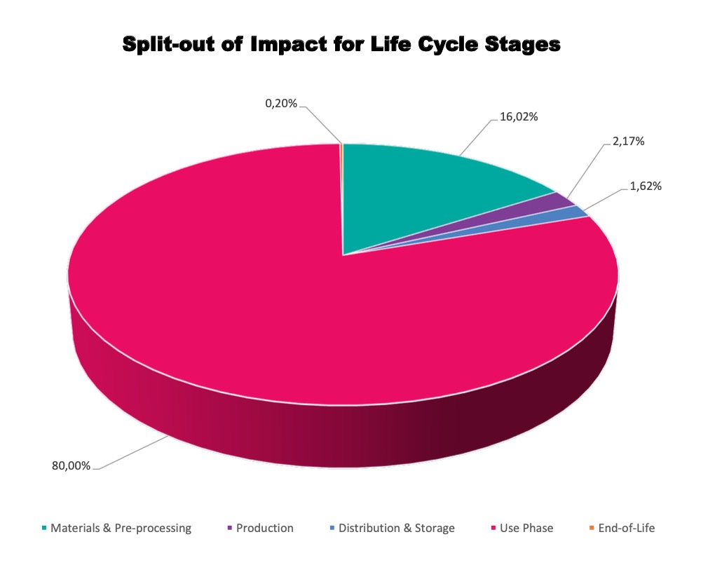 Med dessa Viverk-specifika ramar för analyserna visade det sig att en industritvättanläggning som Viverks Flow-Jet-tvätt har en fördelning av dess CO2-avtryck som ser ut så här under en livscykel: