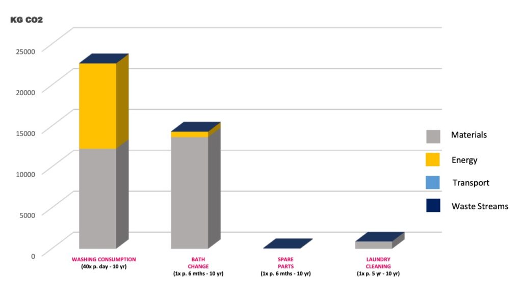 Tittar man på vad det är som ger avtryck och kostnader under användning är det energiförbrukning och förbrukningsmaterial. En djupare analys av förbrukningskostnaderna under en tioårsperiod förtydligar även att avtrycket kan delas upp i tvättförbrukning, badbyten, reservdelar och underhåll på tvättanläggningen.